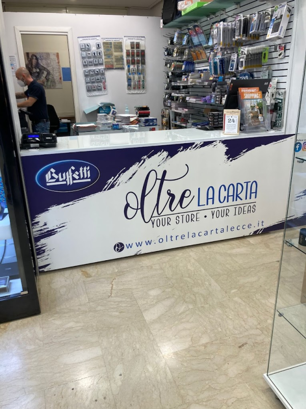 Siamo Oltre la Carta, un negozio che opera da oltre 40 anni nel settore della cancelleria, anche se molti ci conoscono come "la Buffetti di Lecce". Non ci limitiamo a vendere penne, articoli per la scuola, ufficio, modulistica, articoli da regalo e molto altro. Siamo molto di più. Il nostro obiettivo è offrirti un servizio che vada oltre la semplice vendita di prodotti, fornendo soluzioni pensate per ogni esigenza. Nel nostro punto vendita troverai accessori e prodotti per organizzare al meglio il tuo ufficio, oltre a una vasta scelta di articoli scolastici colorati e alla moda. Selezioniamo solo le migliori marche del mercato, come Stabilo, Staedtler, Pilot e, naturalmente, Buffetti, un nome che da sempre rappresenta l'eccellenza nel settore. Siamo al servizio di piccole e medie imprese, grandi aziende, Pubblica Amministrazione, liberi professionisti, artigiani, commercianti e studenti, con soluzioni adatte a ciascuno.